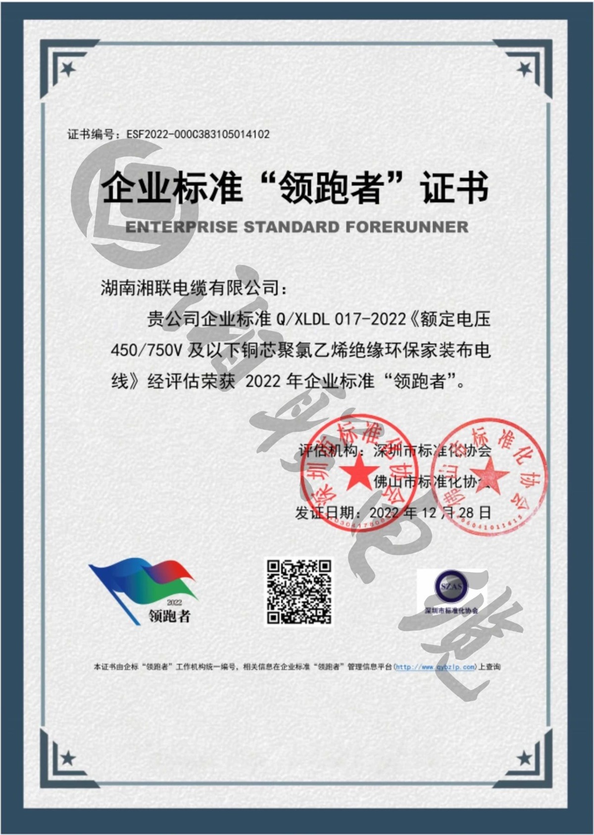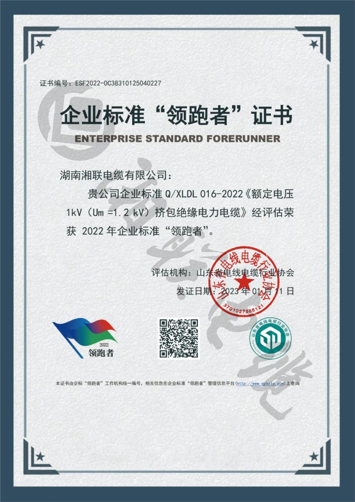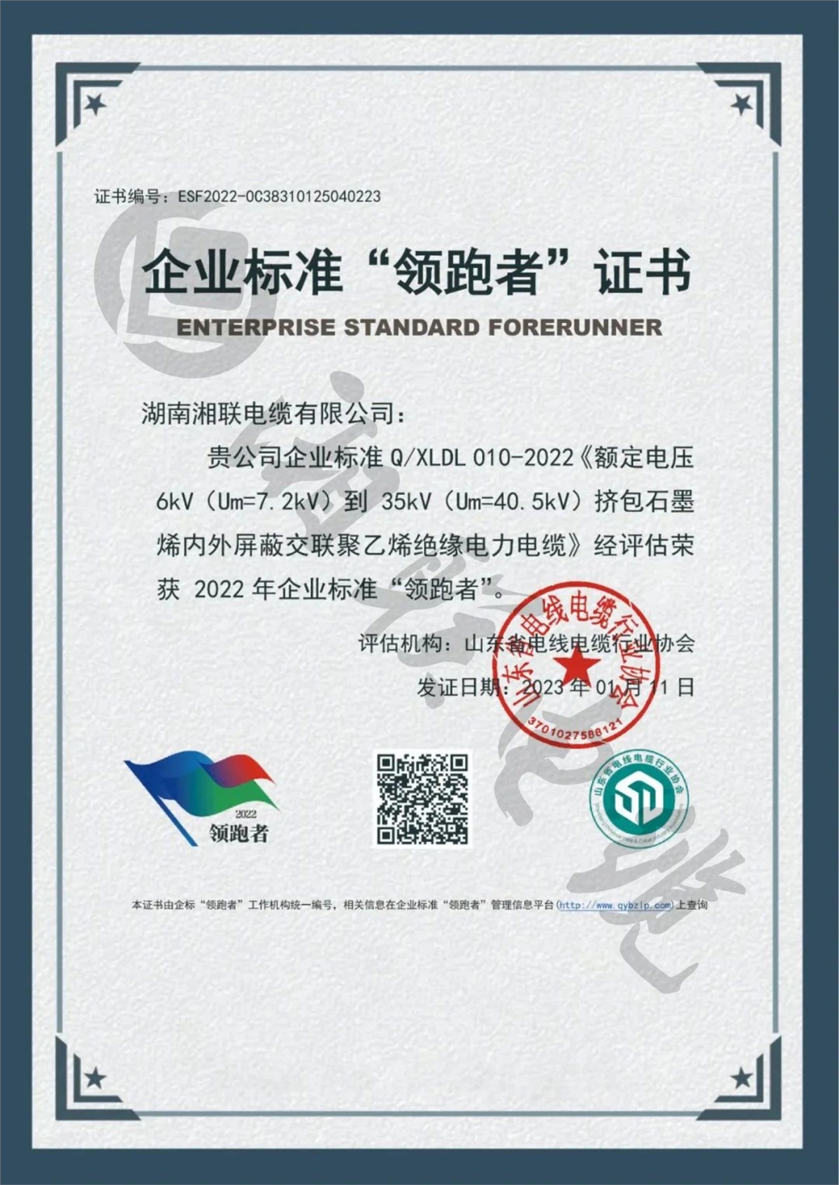 1月,湖南湘聯電纜有限公司三項企業標準經評定,榮獲2022年全國企業標準“領跑者”。