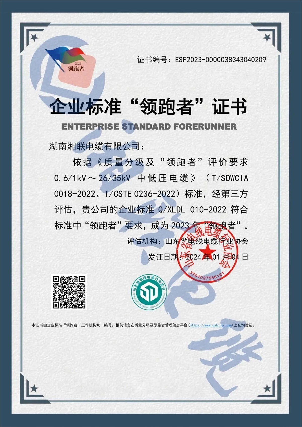 近日,企業標準領跑者管理信息平臺公布了2023年企業標準領跑者名單,湖南湘聯電纜有限公司憑借企業標準Q/XLDL 010-2022,成為2023年企業標準“領跑者”,湘聯電纜連續三年獲此殊榮。