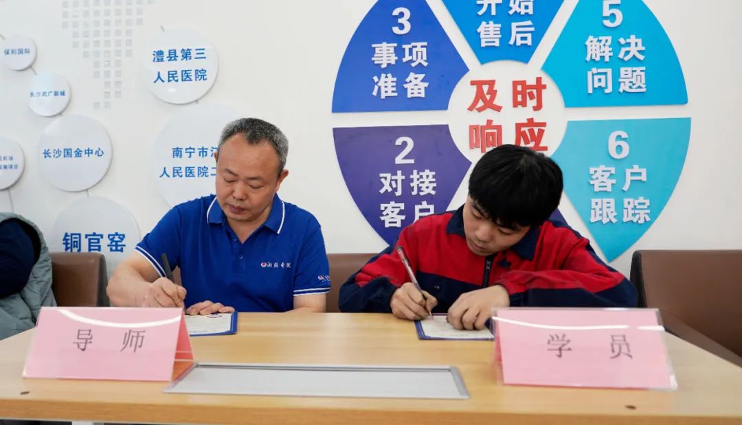 2024年“芯”火計劃選取了工作責任心強、技術能力過硬、工作經(jīng)驗豐富的管理人員作為培訓講師,根據(jù)7位青年職工的崗位技能需求和講師的專業(yè)領域,分崗位系統(tǒng)化、有針對性地對7位徒弟進行技術知識、技能實操以及工藝管理等方面的培訓。在開班儀式上,講師和學員通過簽訂師徒帖、發(fā)表宣言、獻花等環(huán)節(jié),隆重完成師徒結對儀式,形成緊密和諧的師徒關系。